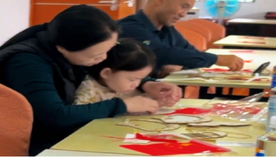 随着材料包的分发,DIY环节正式拉开序幕。大人与孩子默契配合,穿线、粘贴、组装、点缀……指尖翻飞间,原本零散的竹篾、彩纸、流苏渐渐有了形状。每一步都饱含耐心与创意。遇到难题时,大家互相支招、彼此协助,工作人员也穿梭其间细致指导。当一盏盏造型各异的灯笼在手中点亮,暖黄的光晕映照着每个人的笑脸,现场瞬间变成了欢乐的海洋,大家纷纷举起自己的作品拍照留念,定格下这份独属于双节的喜悦。