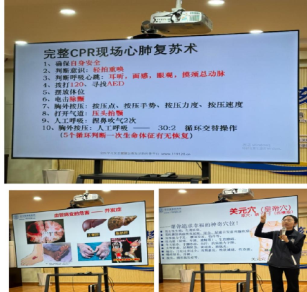 讲座现场,员工们认真聆听、仔细记录,氛围浓厚。讲师围绕员工日常工作生活中易遇到的健康问题,深入解析肥胖与高血压、高血脂、高血糖的关联,指出肥胖是诱发脂肪肝、心脑血管疾病的重要因素,分享了科学的饮食搭配、运动规划等体重管理方法。同时重点讲解心梗、脑梗的发病前兆与预防要点,并现场演示人工心肺复苏的标准操作流程。